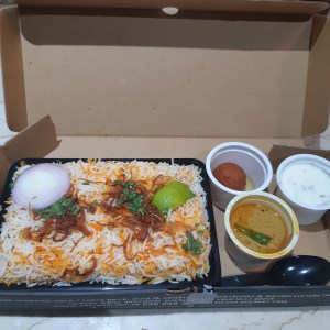 Impressed with the Biryani options but still inclined to play safe, I went ahead with Hyderabadi Chicken Dum Biryani (one private box, more masala). I was super tempted to try the mutton biryani. But owing to some sour experiences in the past with mutton-based dishes in other restaurants, I curbed my cravings and limited them to chicken.